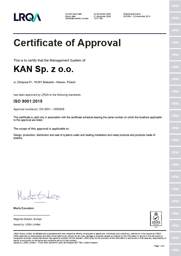 A KAN  arra törekszik, hogy teljes mértékben biztosítsa ügyfeleinek elégedettségét, ügyelve a  KAN-therm rendszerek fejlesztésére és modernizálására, és biztosítva a termékkínálat kiváló minőségét és a szolgáltatások magas színvonalát. Ezt igazolja a dokumentált, üzemeltetett és teljes mértékben megvalósított ISO 9001:2015 szabványon alapuló Minőségirányítási rendszer, melynek hatékonyságát továbbra is folyamatosan fejlesztjük. A tanúsítványt az elismert Lloyd's Register Quality Assurance Limited tanúsító szervezet bocsátotta ki.